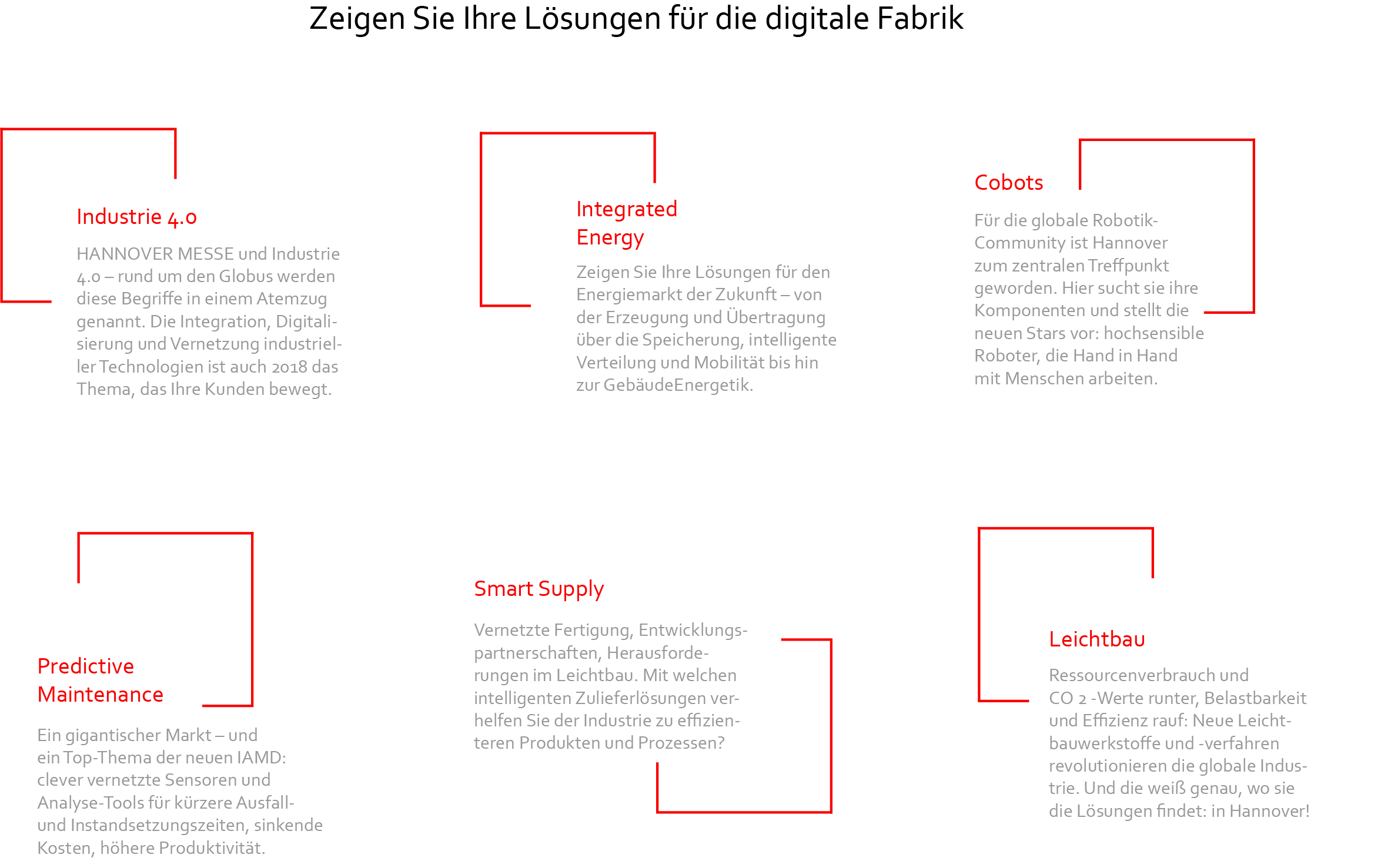 Die HANNOVER MESSE ist einzigartig. Nur sie bringt so viele Branchen gleichzeitig zusammen. Nur sie stellt alle Industrie- und Energie-Technologien entlang der gesamten Wertschöpfungs- kette dar. Die Synergien, die sich aus diesem integrierten Konzept ergeben, machen die HANNOVER MESSE zum globalen Treffpunkt für Entscheider und Anwender.