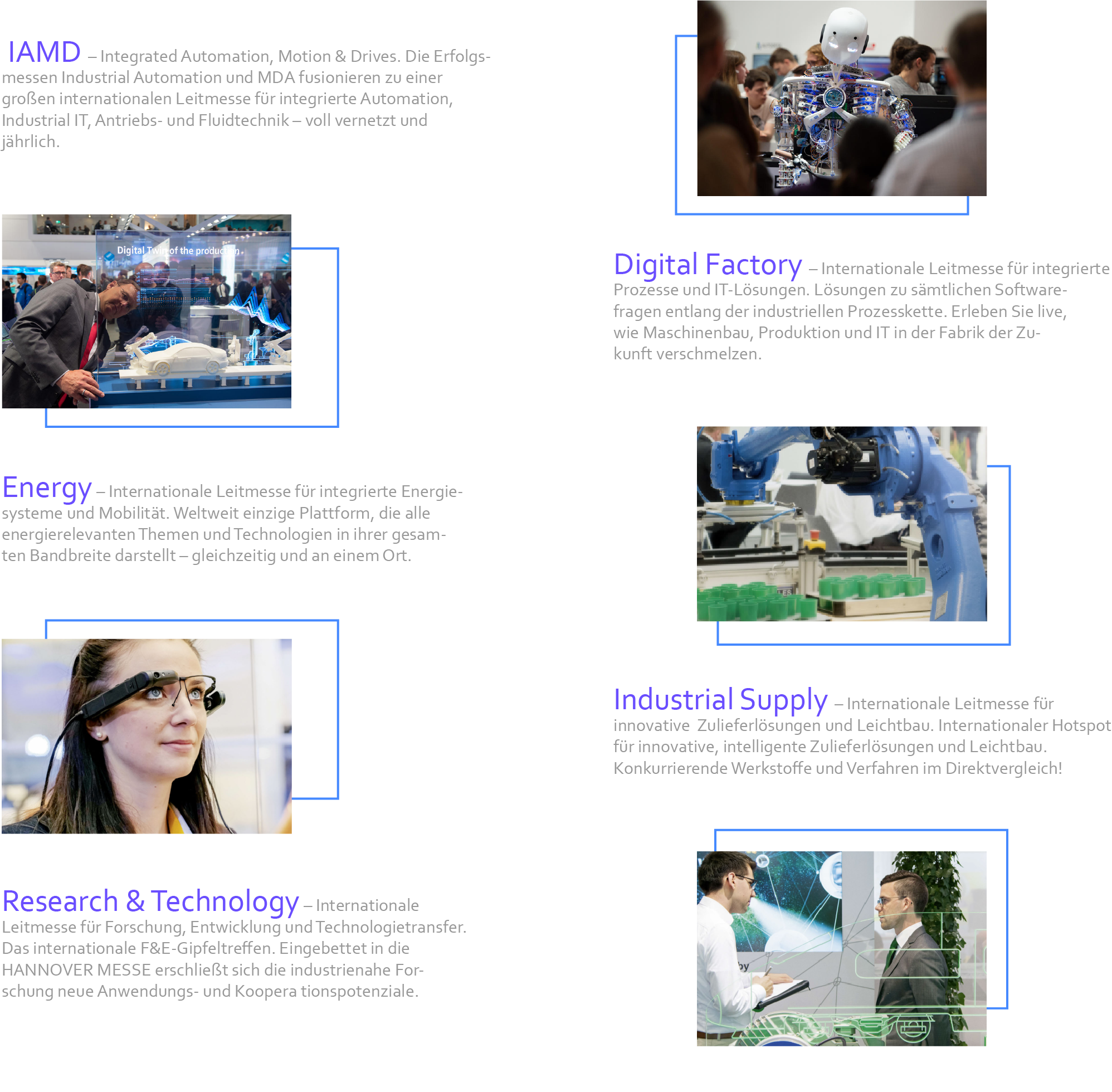 Die HANNOVER MESSE ist das weltweit wichtigste Technologieereignis. Rund 6.500 Aussteller aus über 70 Ländern präsentieren auf der HANNOVER MESSE die maßgebenden Themen Industrieautomation, Energietechnologien, Antriebs- und Fluidtechnik, Mobilität, Zulieferung, Zukunftstechnologien und Nachwuchs. Die HANNOVER MESSE vereint verschiedene internationale Leitmessen unter einem Dach: Industrial Automation, Motion, Drive & Automation, Digital Factory, Energy, Wind, ComVac, Industrial Supply, Surface Technology und Research & Technology.